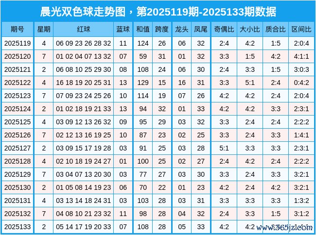 双色球第2025133期红球奖号为:05 14 17 19 20 33 ;蓝球07。红球号码质合比为3:3,奇偶比为4:2,三区比为1:4:1。